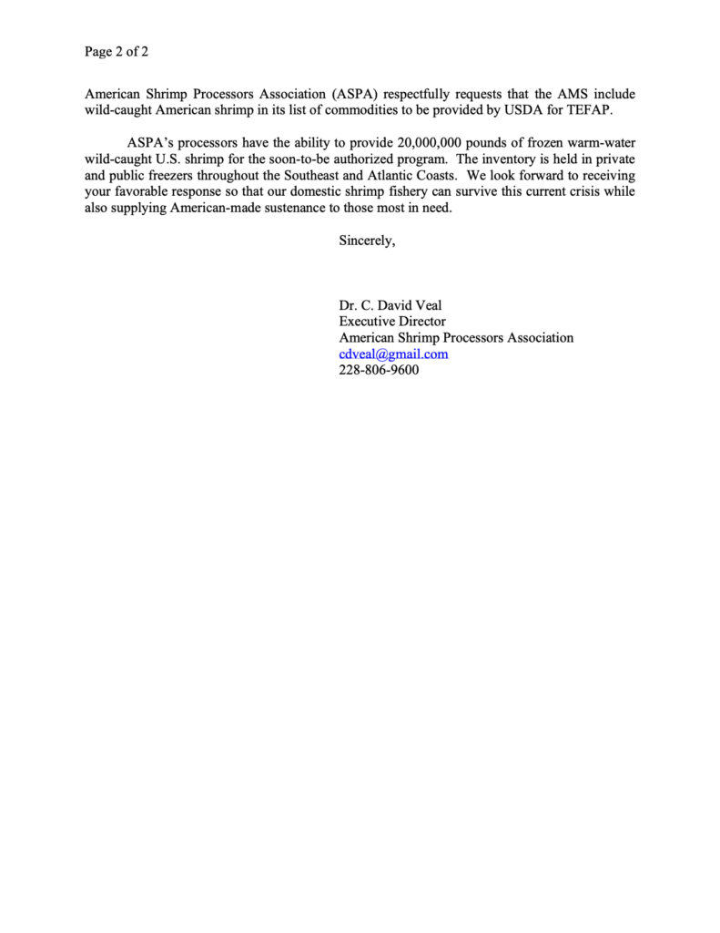 ASPA Letter Draft to AMS for Shrimp Inclusion 03.24-2 March 25, 2020 Previous Post:American Shrimp Processors Association Calls for Shrimp to Be Designated as a Commodity Purchase