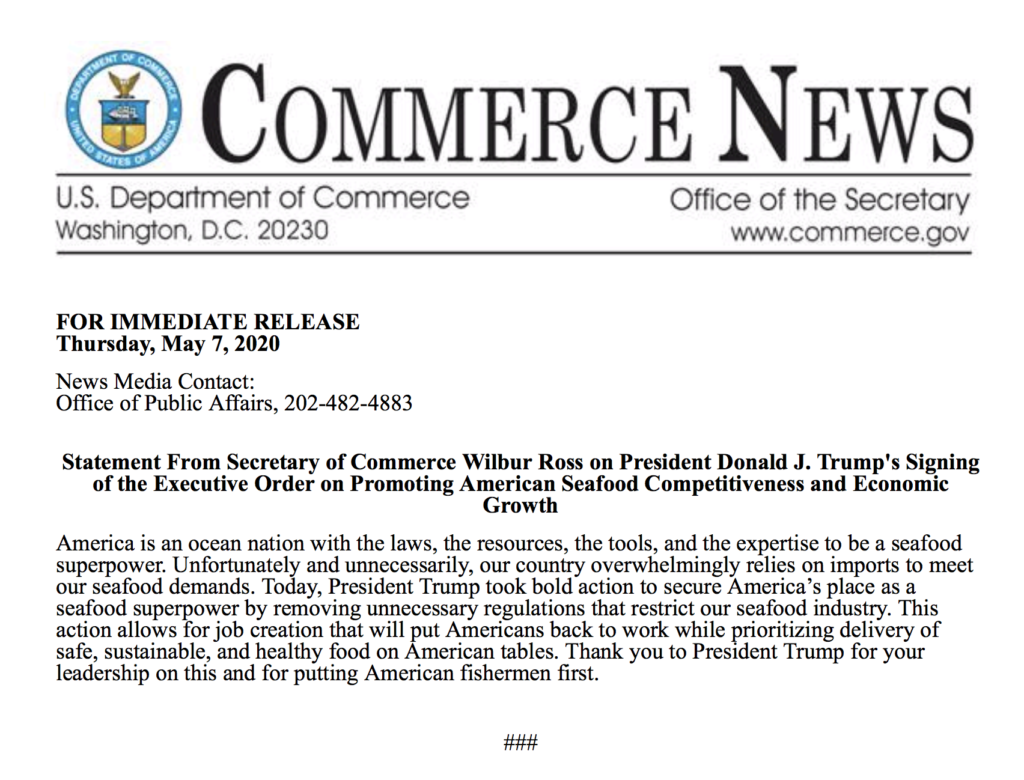 DeptofCommerceStatementWhiteHouse May 8, 2020 Previous Post:Statement From Secretary of Commerce Wilbur Ross on President Donald J. Trump’s Signing of the Executive Order on Promoting American Seafood Competitiveness and Economic Growth